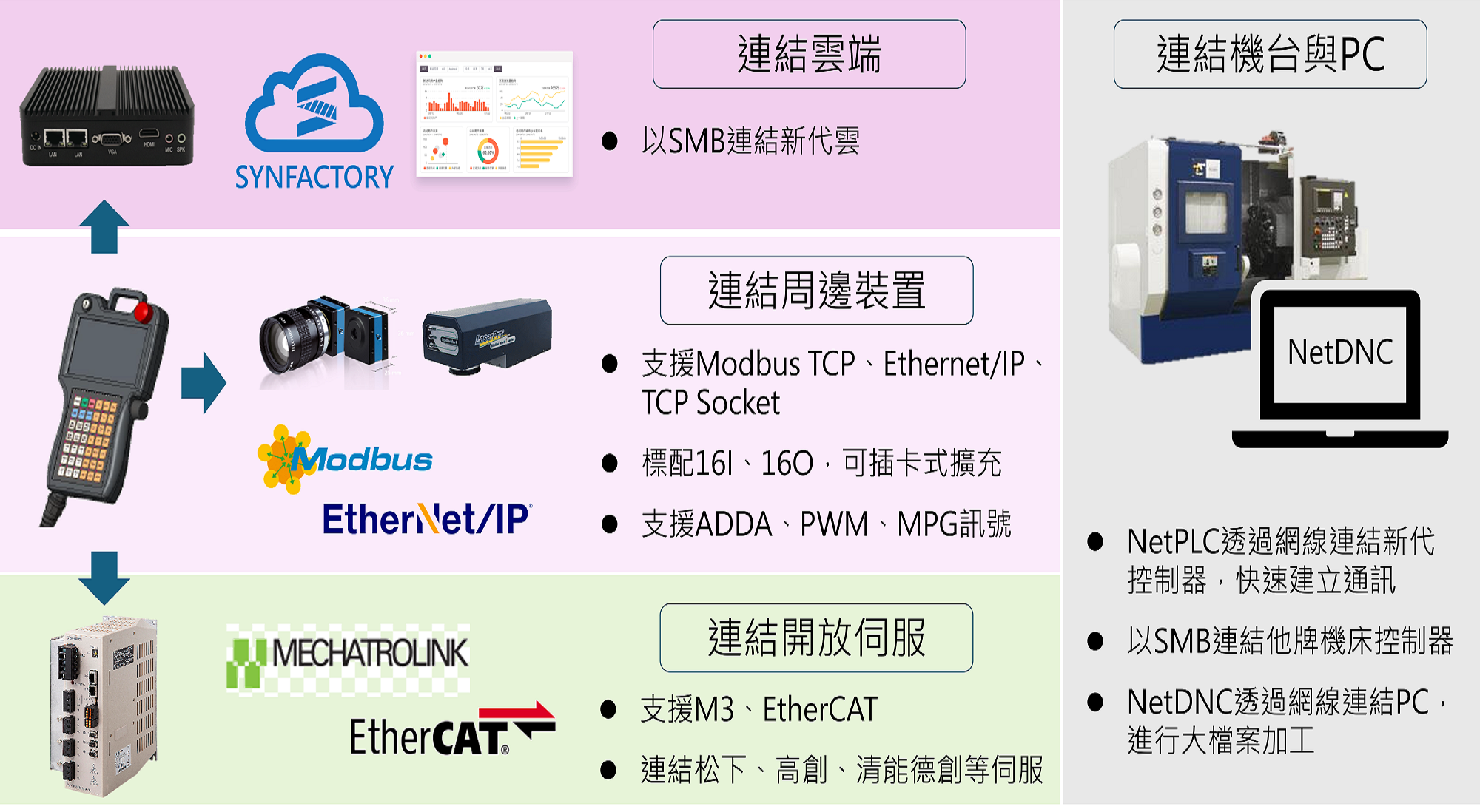 5.支援开放伺服通讯(MECHATROLINK III、EtherCAT ),搭配多种市售驱动器