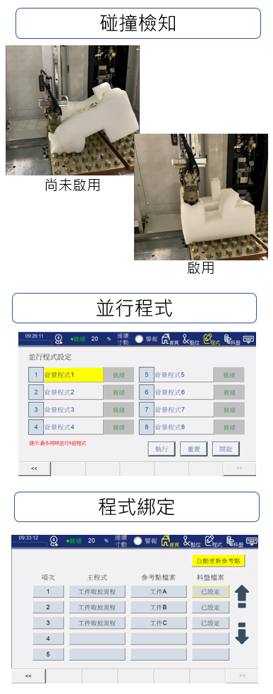 -碰撞保护 : 异常外扰力检知与碰撞回退 -并行程式 : 降低撰写PLC的成本 -程式绑定 : 一键切换加工档案