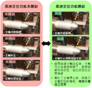 启用高速主轴定位功能后,主轴可以从高速旋转直接定位在任意角度,增加分度效率